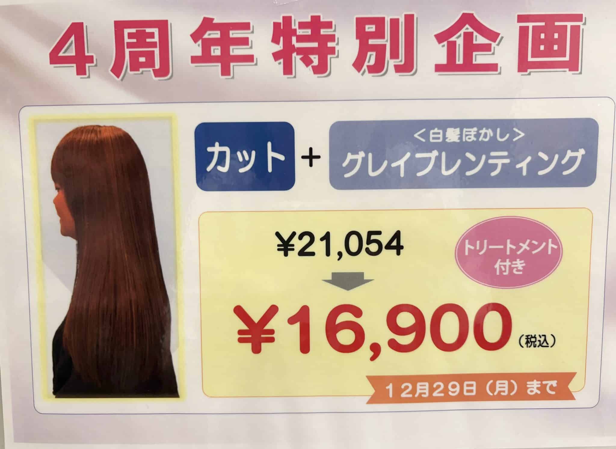 ㊗️4周年企画第2弾🎊 ニュース 2025.11.06 🌙🌙🌙 4周年企画 第2弾🌟 日頃からお世話になっている皆さまに感謝を込めて♡ 新メニュー✨白髪ぼかしカラーです💁♀️ 細かいハイライトを入れて気になる白髪をぼかしていく人気メニューです! 髪のダメージをおさえツヤのある仕上がりを実現するイノアカラーを使用し施術していきます! 12月29日までのキャンペーンになりますので ご予約はお早めにお願い致します⛄️🩷